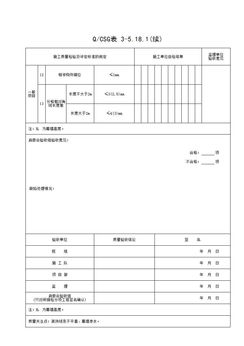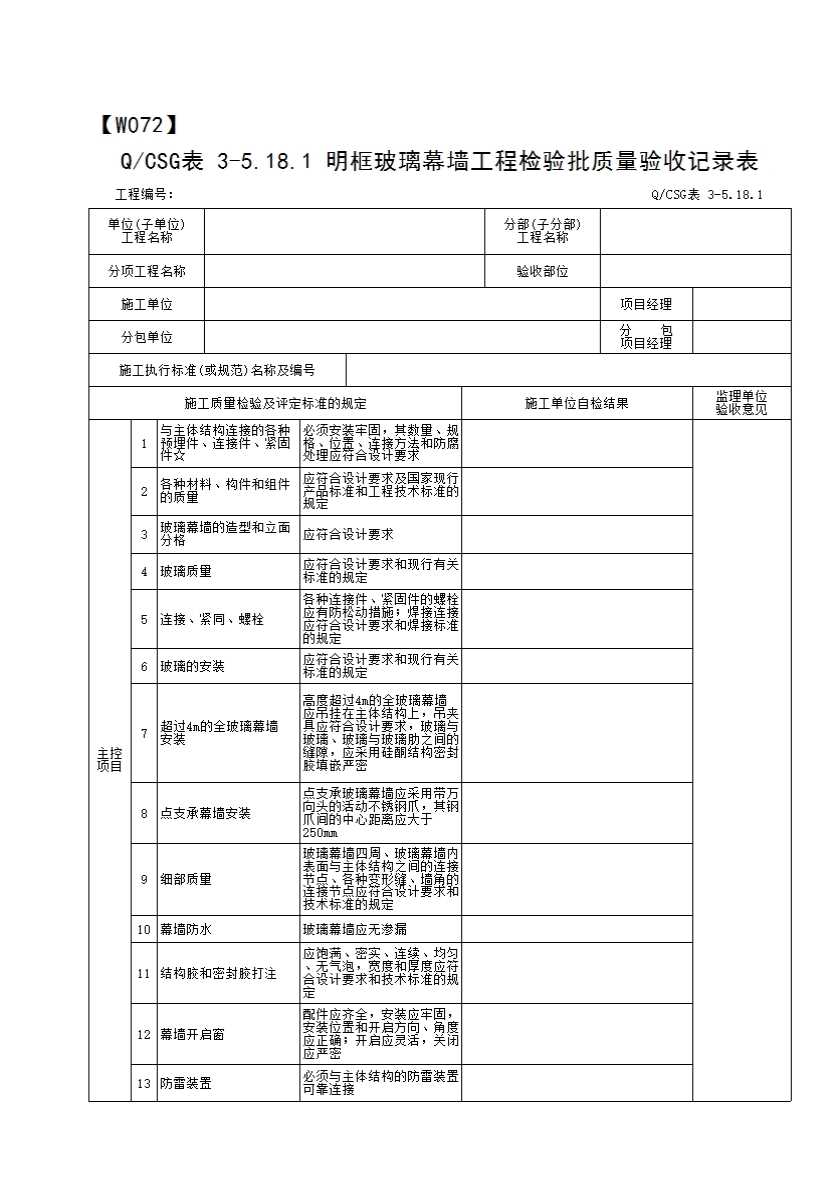 QCSG 表 3-5.18.1 明框玻璃幕墙工程检验批质量验收记录表