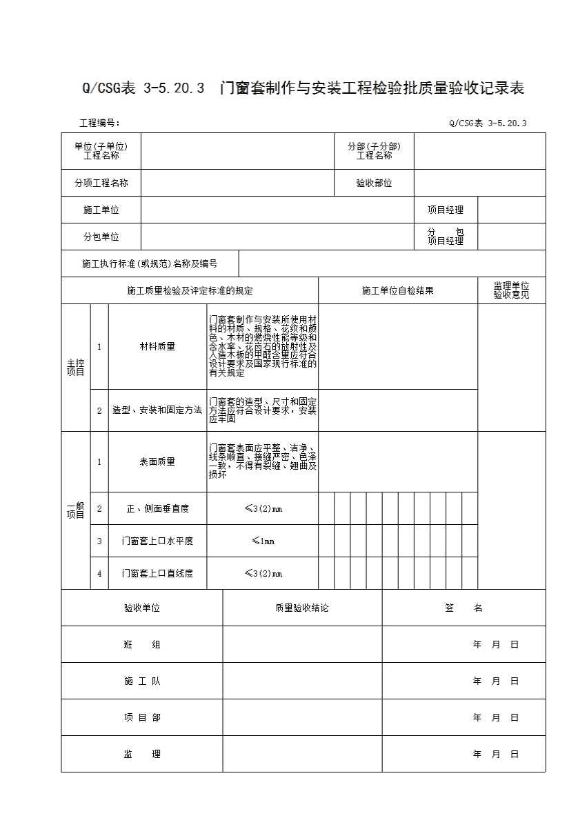 表格名称:QCSG 表 3-5.20.3 门窗套制作与安装工程检验批质量验收记录表
