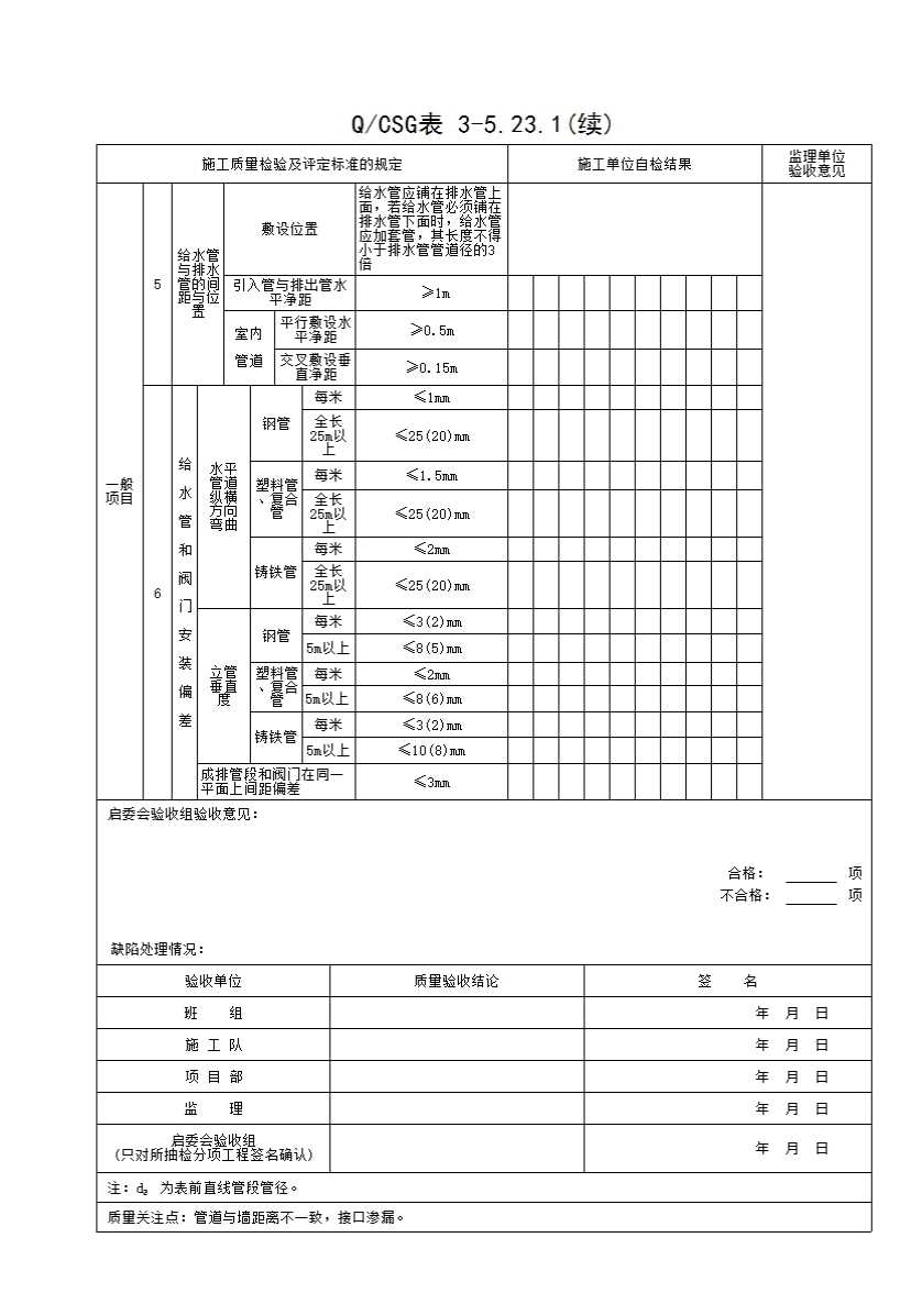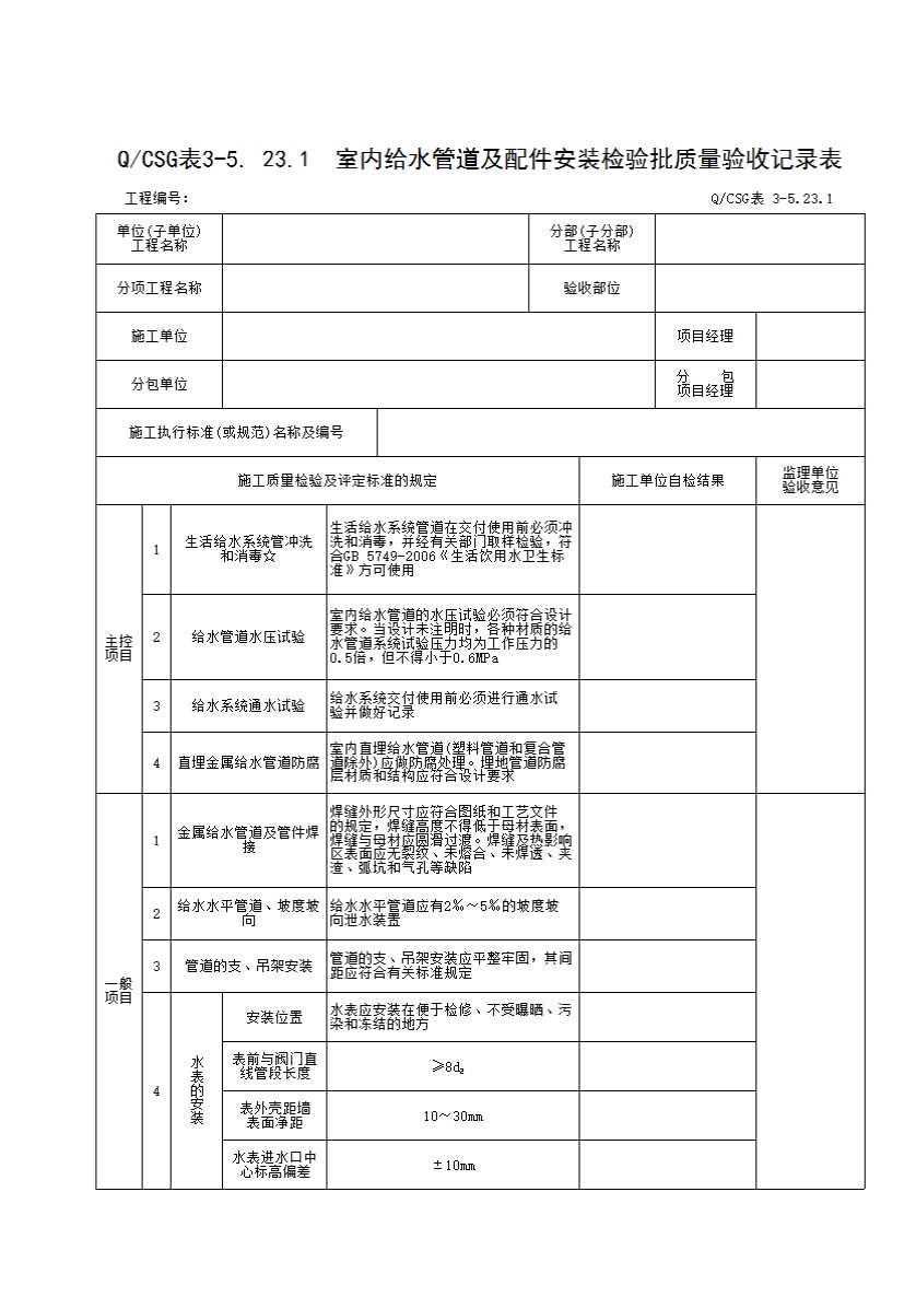 表格名称:QCSG 表 3-5.23.1 室内给水管道及配件安装检验批质量验收记录表