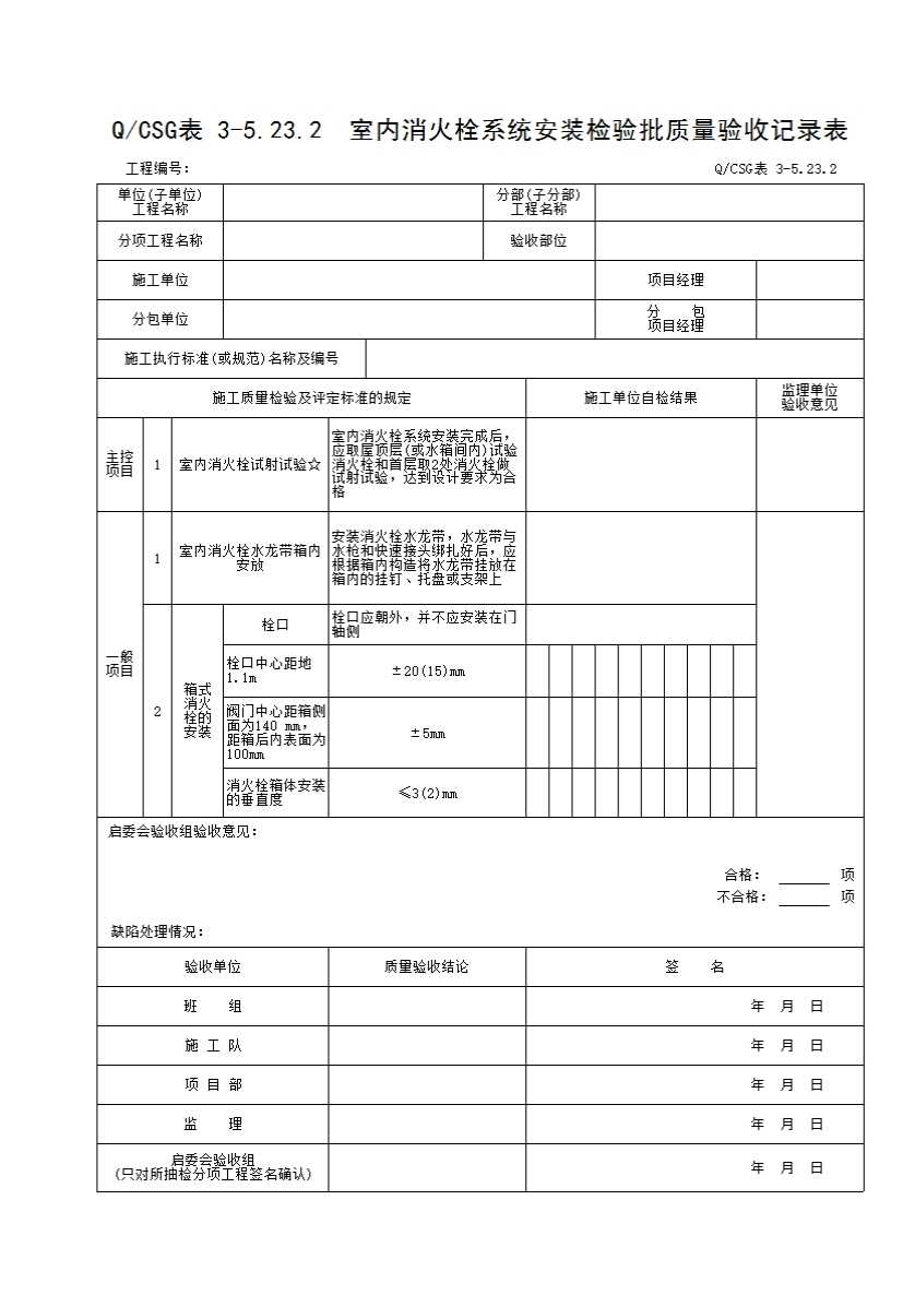 表格名称:QCSG 表 3-5.23.2 室内消火栓系统安装检验批质量验收记录表