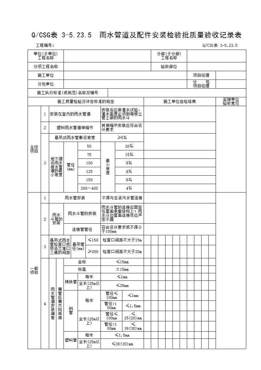 表格名称:QCSG 表 3-5.23.5 雨水管道及配件安装检验批质量验收记录表