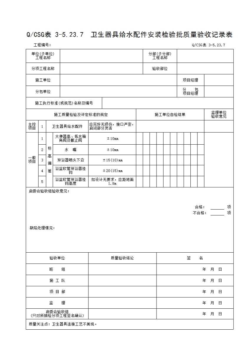 表格名称:QCSG 表 3-5.23.7 卫生器具给水配件安装检验批质量验收记录表