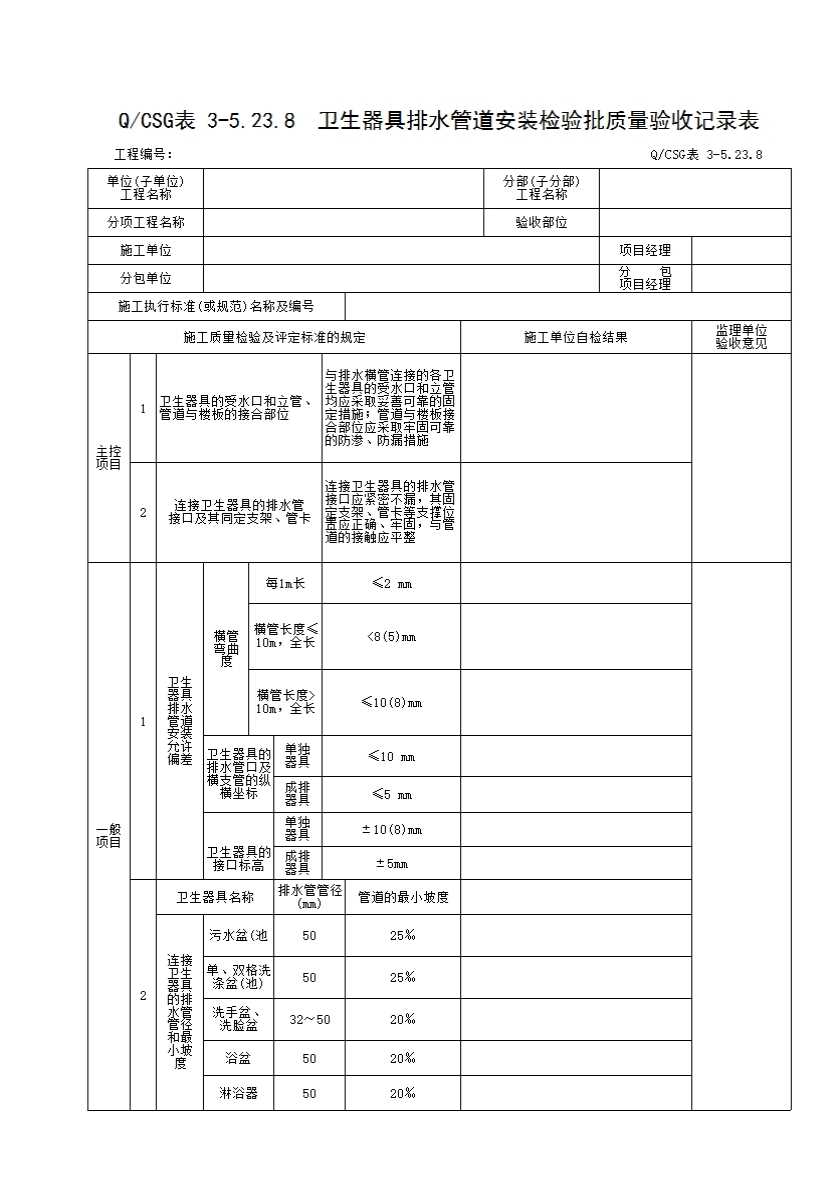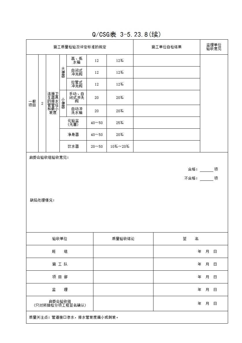 QCSG 表 3-5.23.8 卫生器具排水管道安装检验批质量验收记录表