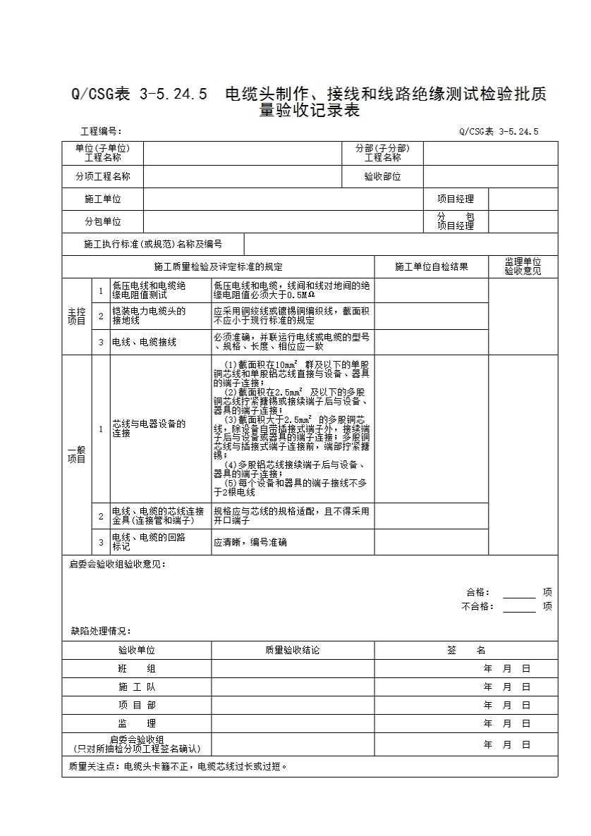 表格名称:QCSG 表 3-5.24.5 电缆头制作、接线和线路绝缘测试检验批质量验收记录表