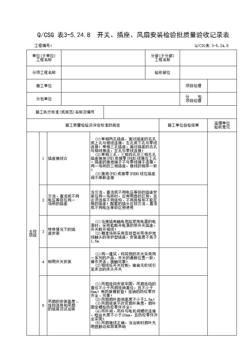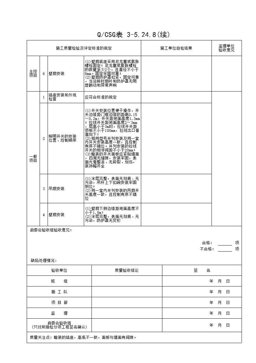 QCSG 表 3-5.24.8 开关、插座、风扇安装检验批质量验收记录表