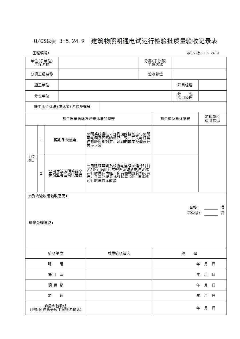 表格名称:QCSG 表 3-5.24.9 建筑物照明通电试运行检验批质量验收记录表