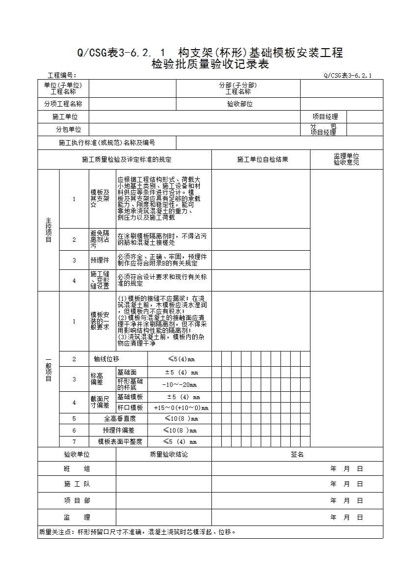表格名称:QCSG 表 3-6.2.1 构支架(杯形)基础模板安装工程检验批质量验收记录表