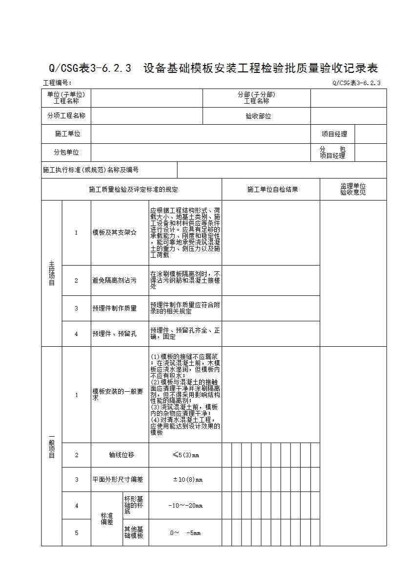 表格名称:QCSG 表 3-6.2.3 设备基础模板安装工程检验批质量验收记录表