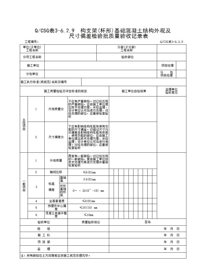 QCSG 表 3-6.2.9 构支架(杯形)基础混凝土结构外观及尺寸偏差检验批质量验收记录表
