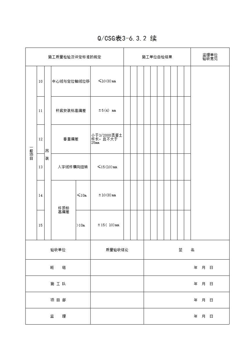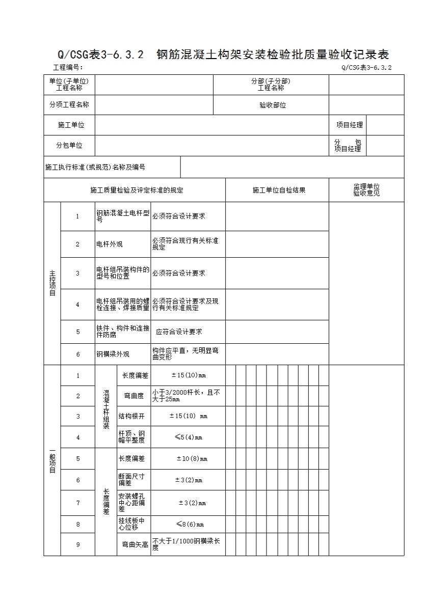 表格名称:QCSG 表 3-6.3.2 钢筋混凝土构架安装检验批质量验收记录表