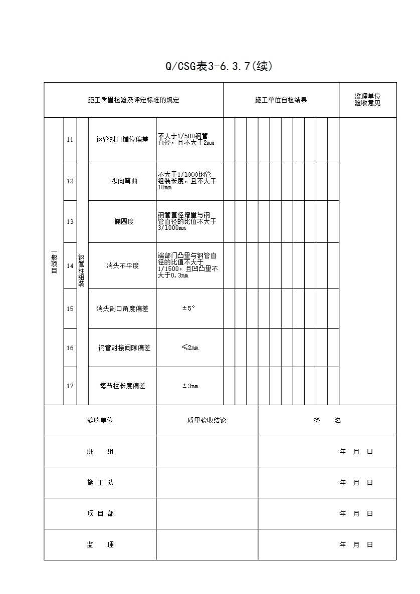 表格名称:QCSG 表 3-6.3.7 钢管混凝土构架组装检验批质量验收记录表