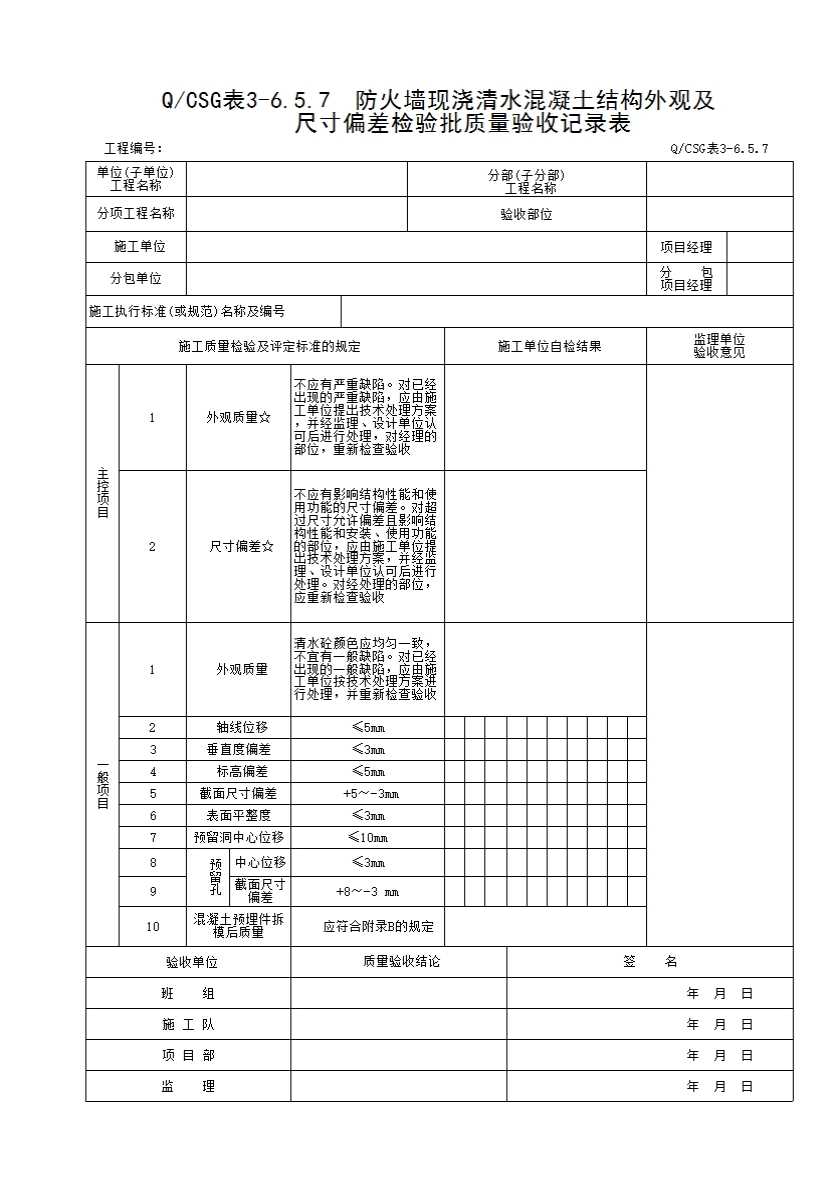 QCSG 表 3-6.5.7 防火墙现浇清水混凝土结构外观及尺寸偏差检验批质量验收记录表