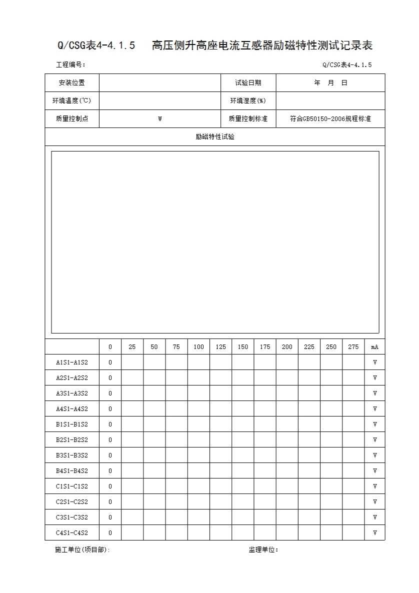表格名称:QCSG 表 4-4.1.5 高压侧升高座电流互感器励磁特性测试记录表