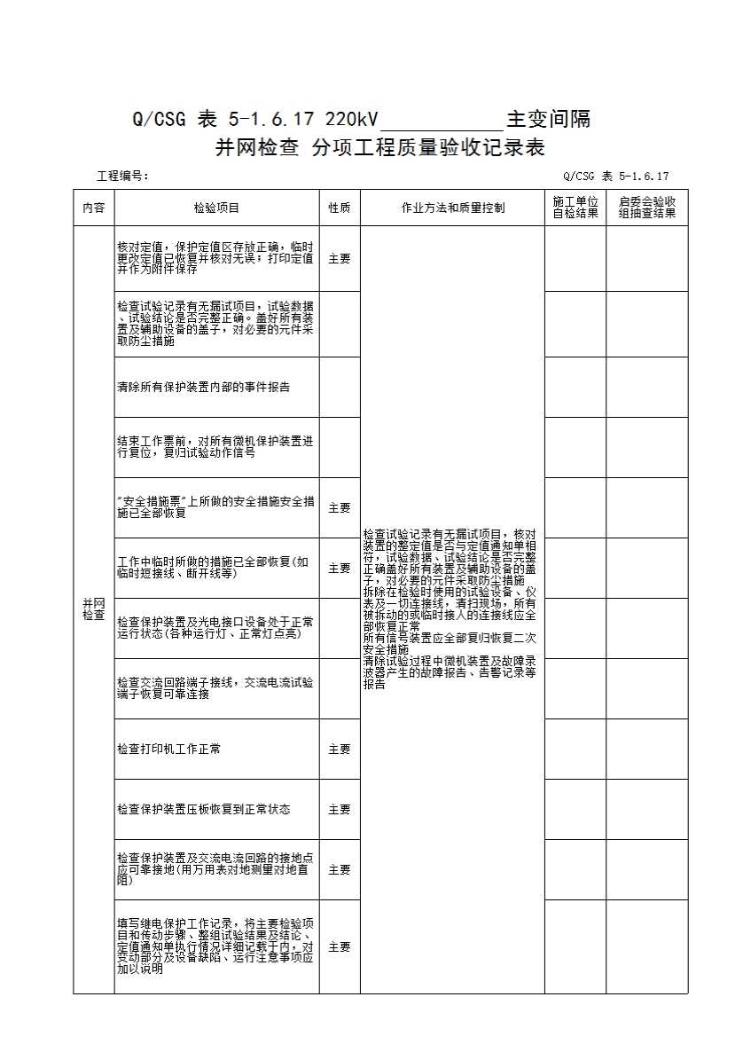 QCSG 表 5-1.6.17 220kV_____主变间隔 并网检查 分项工程质量验收记录表