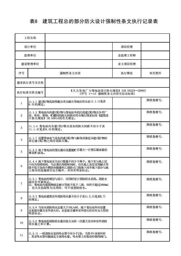 表格名称:表8 建筑工程总的部分防火设计强制性条文执行记录表