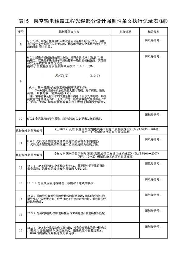 表格名称:表15 架空输电线路工程光缆部分设计强制性条文执行记录表