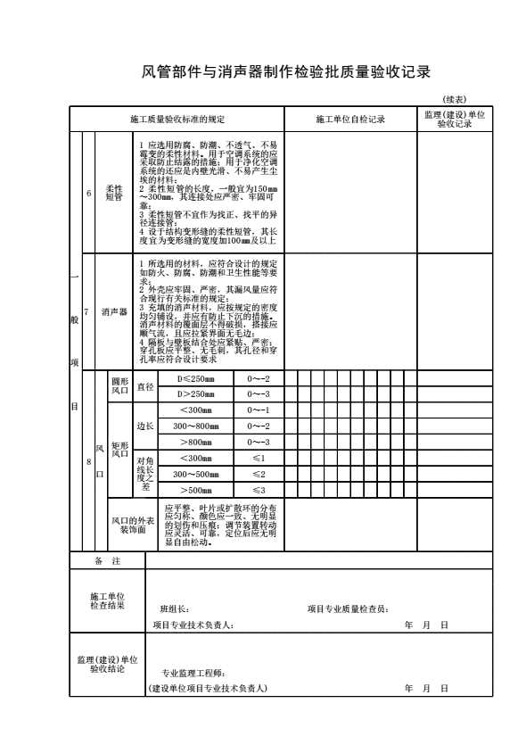 表格名称:风管部件与消声器制作检验批质量验收记录