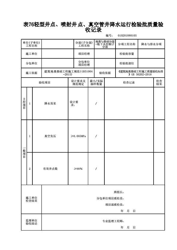 表格名称:010201080105 轻型井点、喷射井点、真空管井降水运行检验批质量验收记录