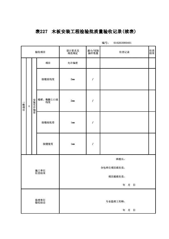表格名称:010203080401 木板安装工程检验批质量验收记录