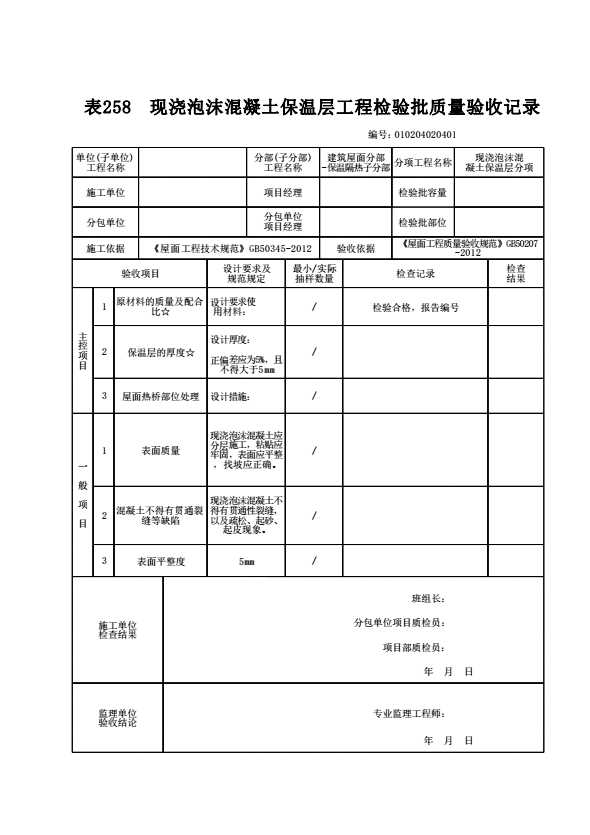 表格名称:010204020401 现浇泡沫混凝土保温层工程检验批质量验收记录