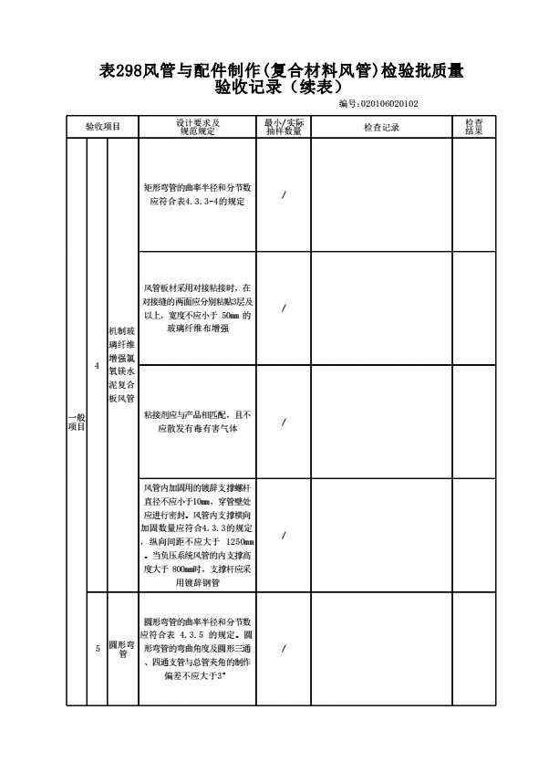 表格名称:020106020102 风管与配件制作(复合材料风管)检验批质量验收记录