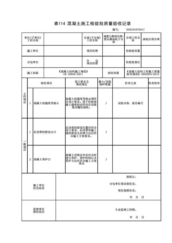 表格名称:050101070417 混凝土施工检验批质量验收记录