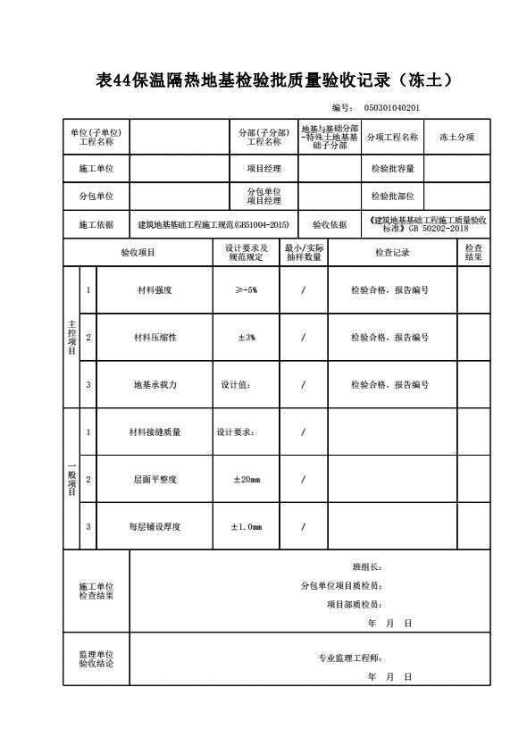 表格名称:050301040201 保温隔热地基检验批质量验收记录(冻土)