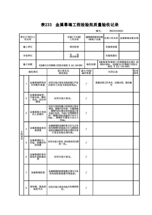 表格名称:080103100201 金属幕墙工程检验批质量验收记录