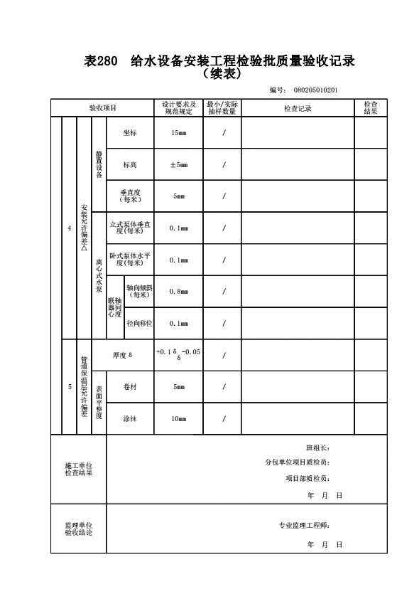 表格名称:080205010201 给水设备安装工程检验批质量验收记录