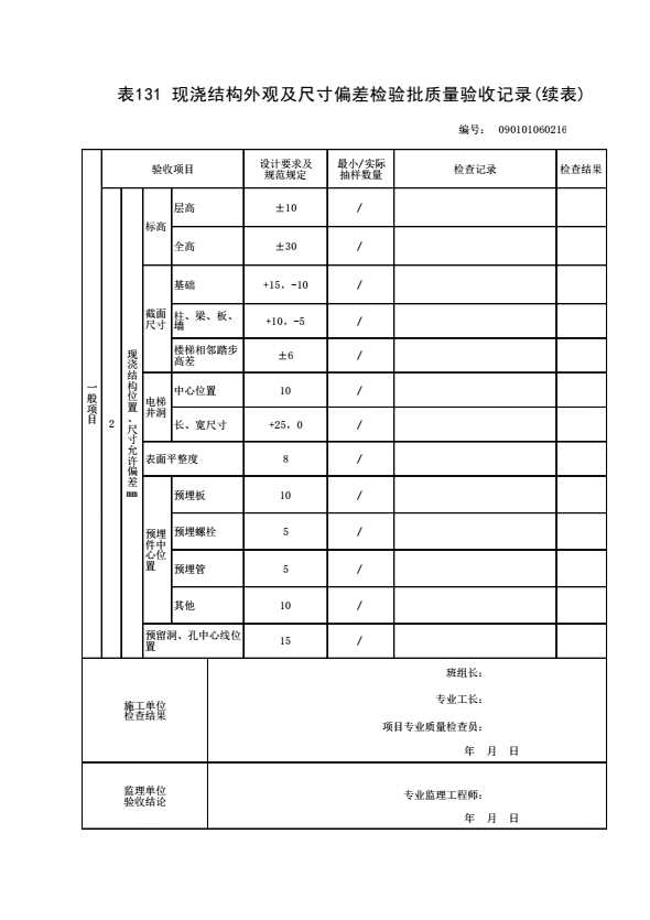 表格名称:090101060216 现浇结构外观及尺寸偏差检验批质量验收记录