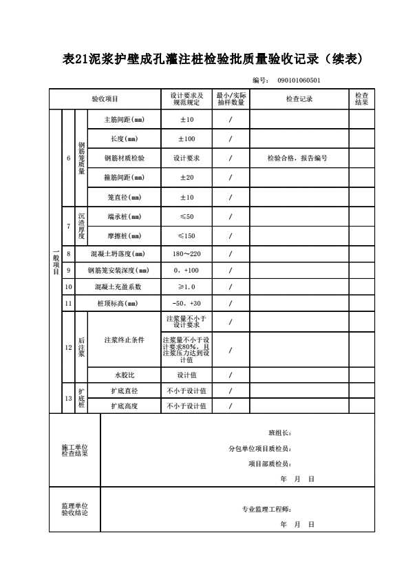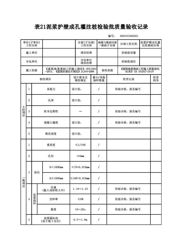 表格名称:090101060501 泥浆护壁成孔灌注桩检验批质量验收记录