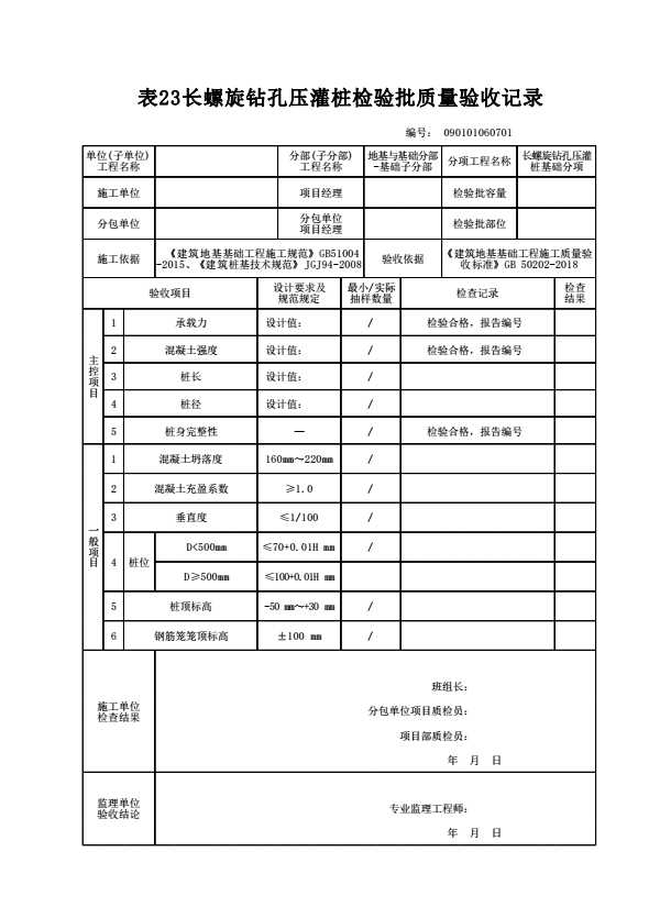 表格名称:090101060701 长螺旋钻孔压灌桩检验批质量验收记录
