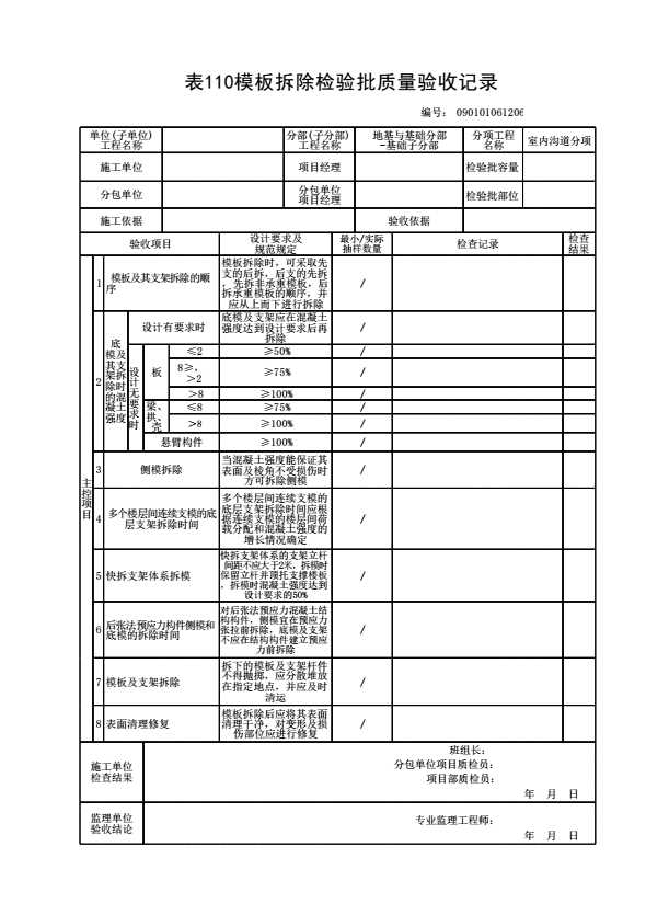 表格名称:090101061206 模板拆除检验批质量验收记录