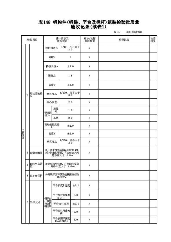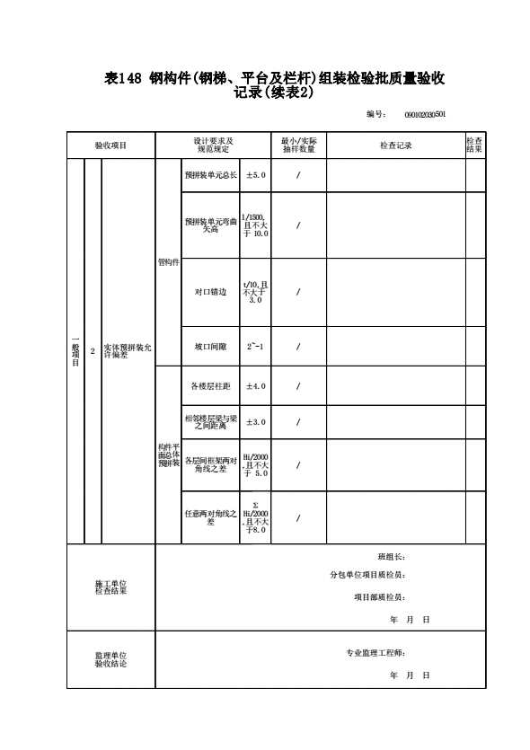 表格名称:090102030501 钢构件预拼装检验批质量验收记录