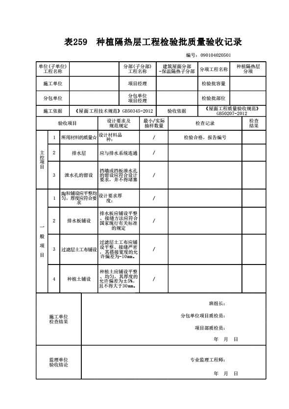 表格名称:090104020501 种植隔热层工程检验批质量验收记录