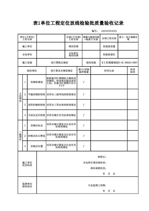 表格名称:120101010101 单位工程定位放线检验批质量验收记录
