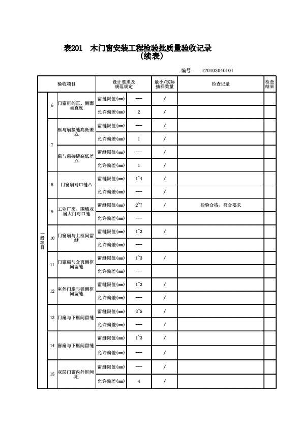 表格名称:120103040101 木门窗安装工程检验批质量验收记录
