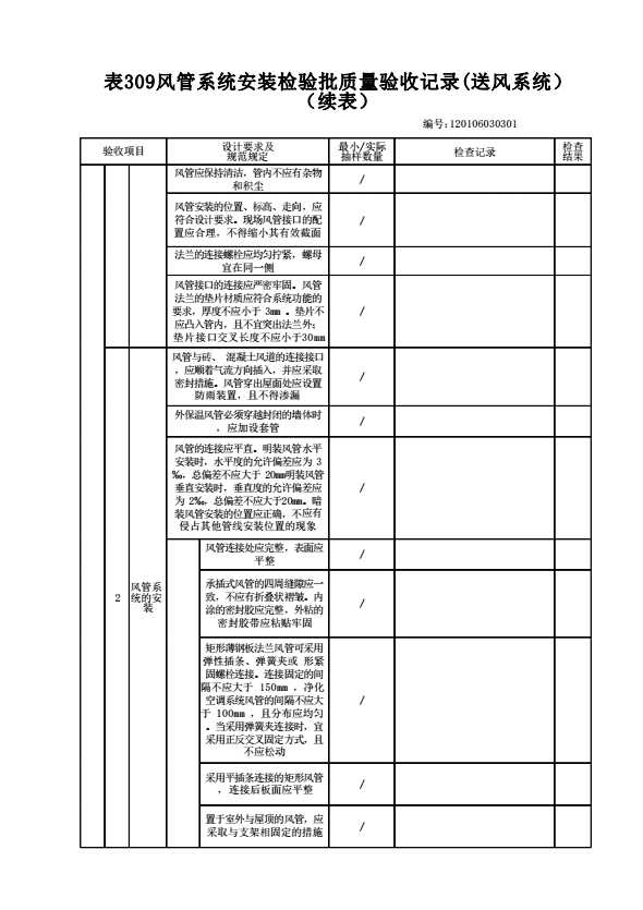 表格名称:120106030301 风管系统安装检验批质量验收记录(送风系统)