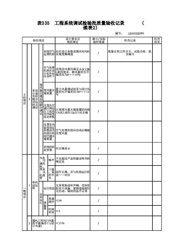 表格名称:120107020901 工程系统调试检验批质量验收记录