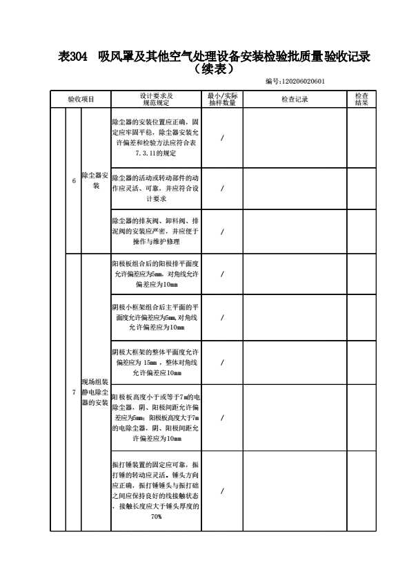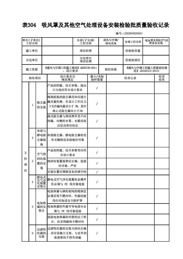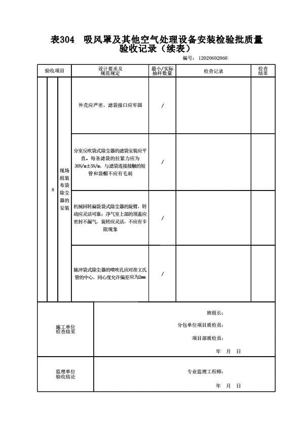 表格名称:120206020601 吸风罩及其他空气处理设备安装检验批质量验收记录