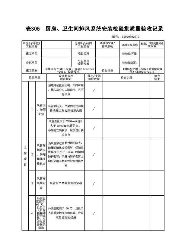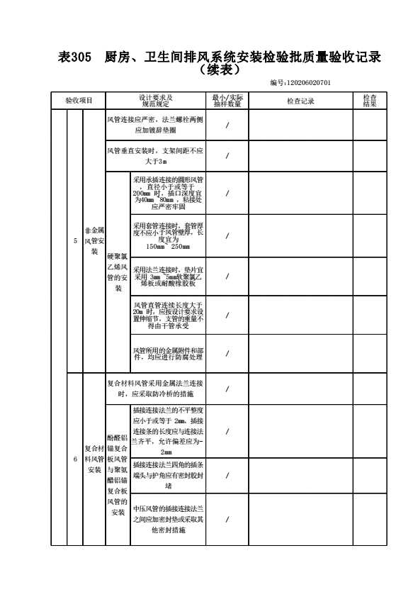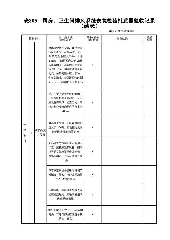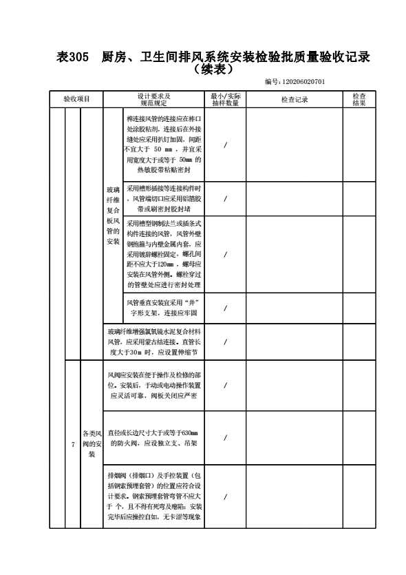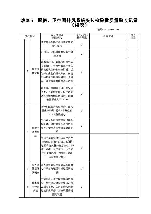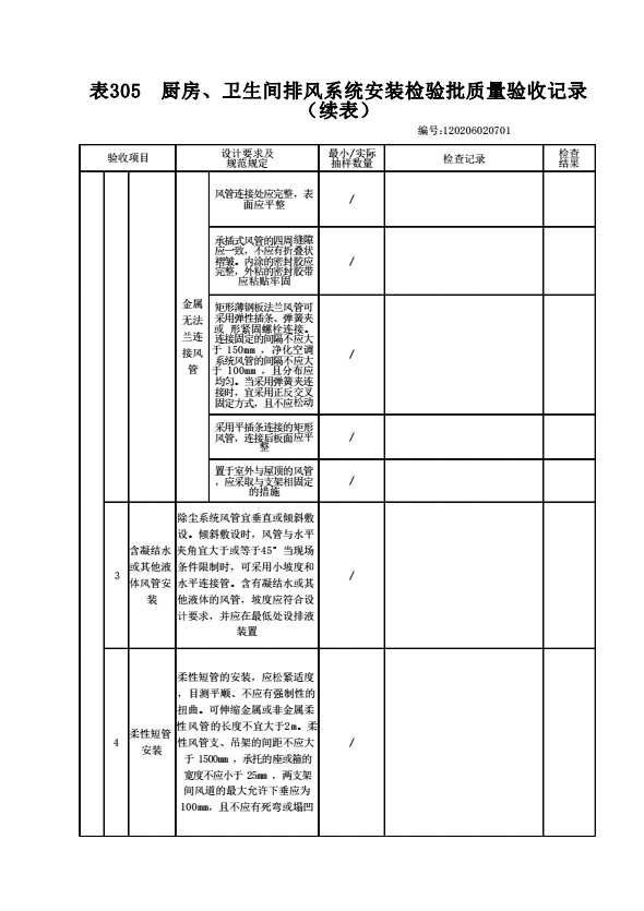 表格名称:120206020701 厨房、卫生间排风系统安装检验批质量验收记录