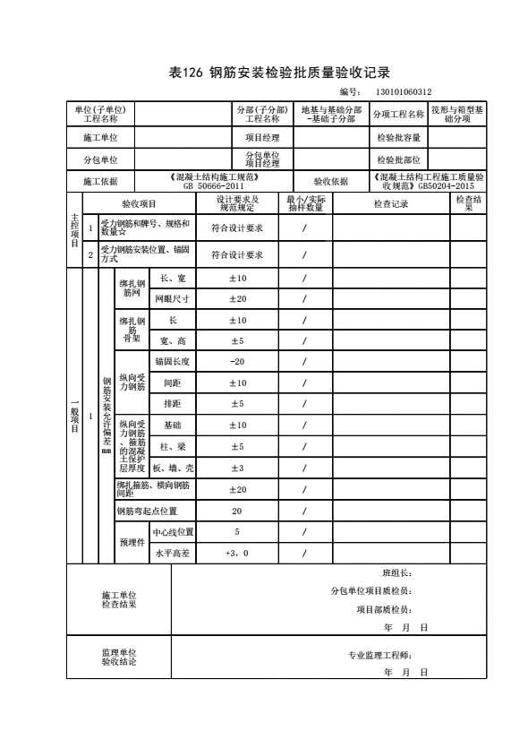 表格名称:130101060312 钢筋安装检验批质量验收记录