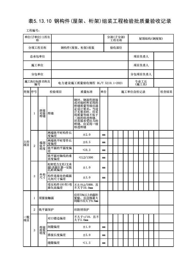 表格名称:表5.13.10 钢构件(屋架、桁架)组装工程检验批质量验收记录