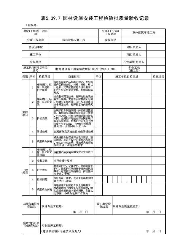 表格名称:表5.39.7 园林设施安装工程检验批质量验收记录