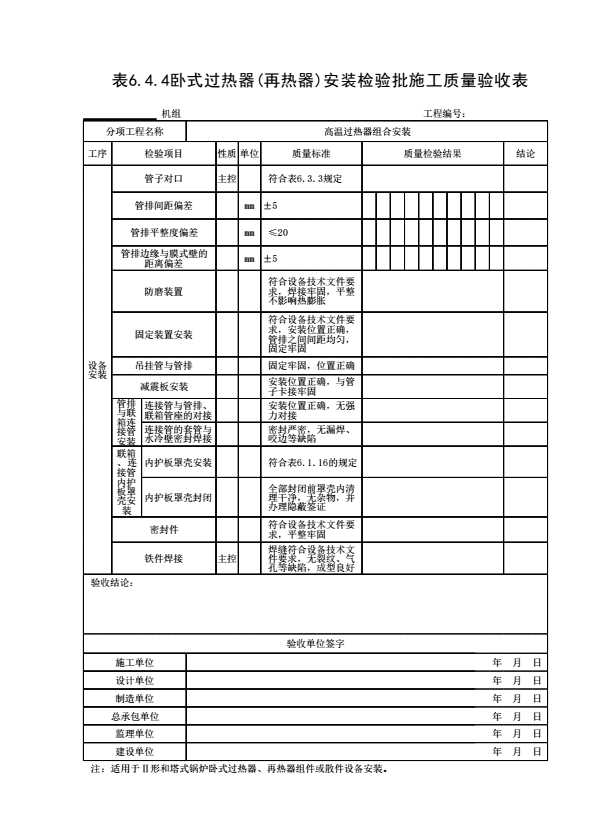 表格名称:表6.4.4 卧式过热器(再热器)安装检验批施工质量验收表
