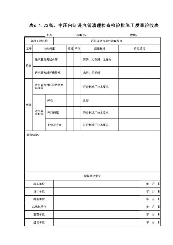 表格名称:表6.1.23 高、中压内缸进汽管清理检查检验批施工质量验收表
