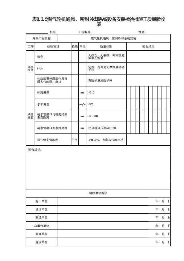 表格名称:表8.3.5 燃气轮机通风、密封冷却系统设备安装检验批施工质量验收表