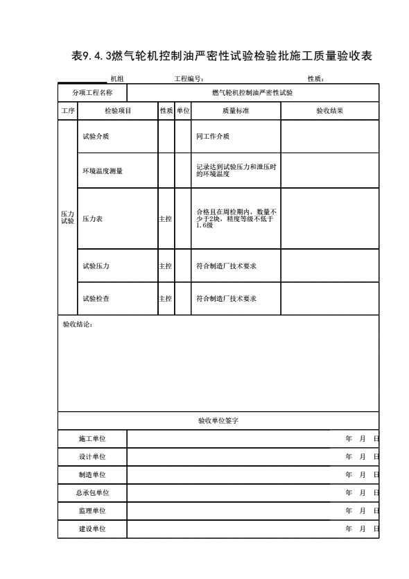 表格名称:表9.4.3 燃气轮机控制油严密性试验检验批施工质量验收表
