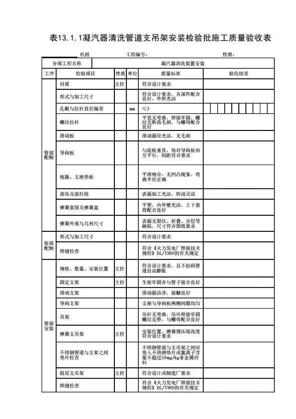 表格名称:表13.1.1 凝汽器清洗管道支吊架安装检验批施工质量验收表
