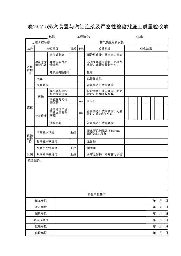 表格名称:表10.2.5 排汽装置与汽缸连接及严密性检验批施工质量验收表